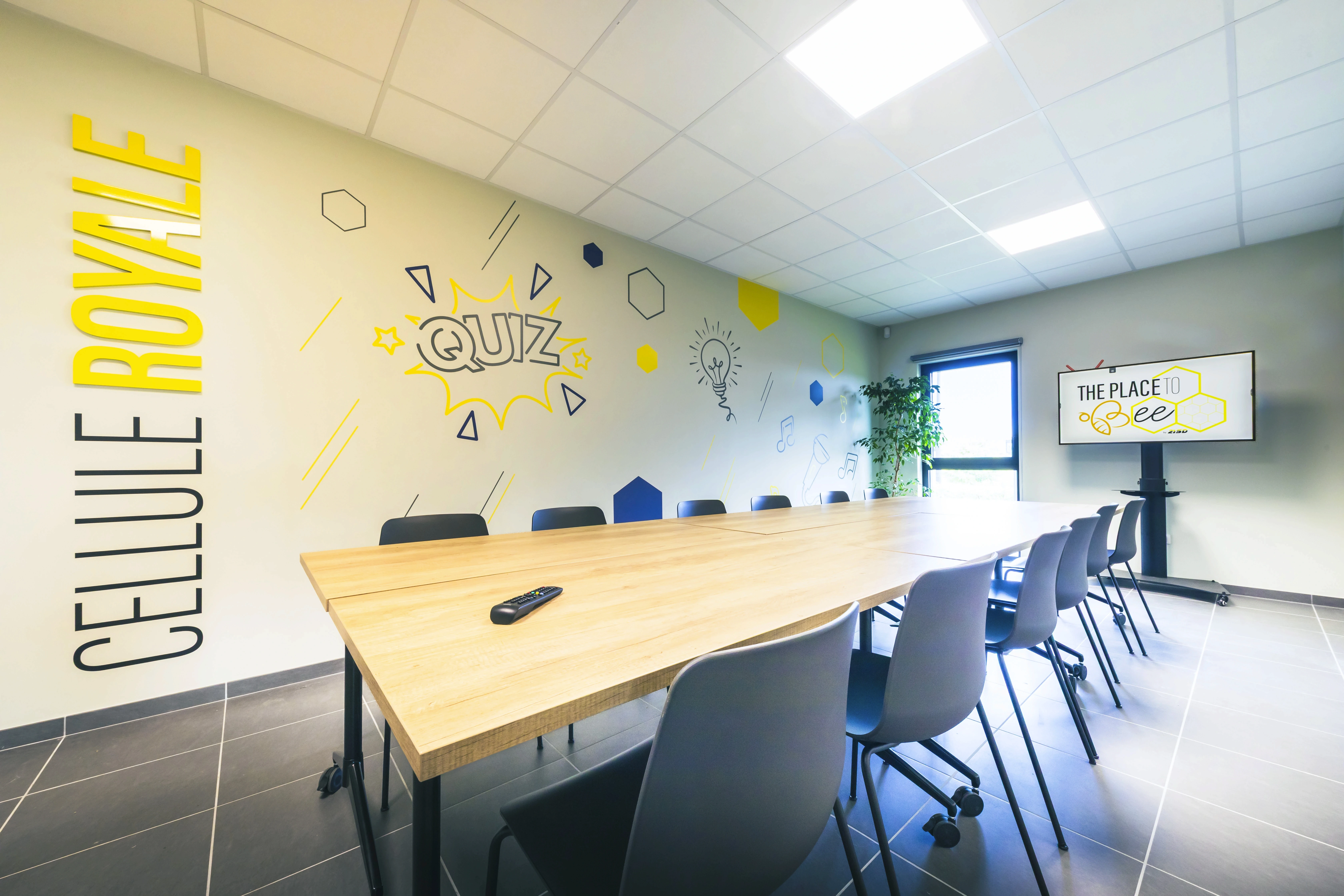 Bienvenue dans La Cellule Royale, un espace pensé pour vos réunions et ateliers créatifs. Pièce modulable pouvant passer de salle de réunion calme à ambiance électrique en mode karaoké, les stickers sur les murs de la Cellule Royale transmettent son ADN. Ici, tout est réuni pour favoriser la concentration, la fluidité des échanges et la prise de décisions dans les meilleures conditions.